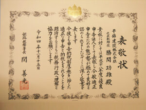 11月15日に姫路税務署長様より3度目となる優良申告法人表敬状を授与いたしました