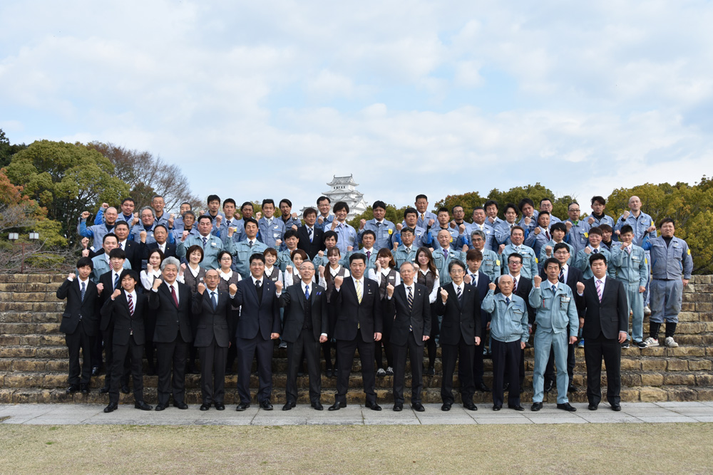 平成31年度入社式が無事に終わりました。 2019年4月1日 平成最後の入社式を終えて、世界遺産姫路城をバックに記念撮影をしました。新しい元号も発表され、社会人として希望に満ちた未来への第一歩です。皆さんの若い力に大いに期待しています。